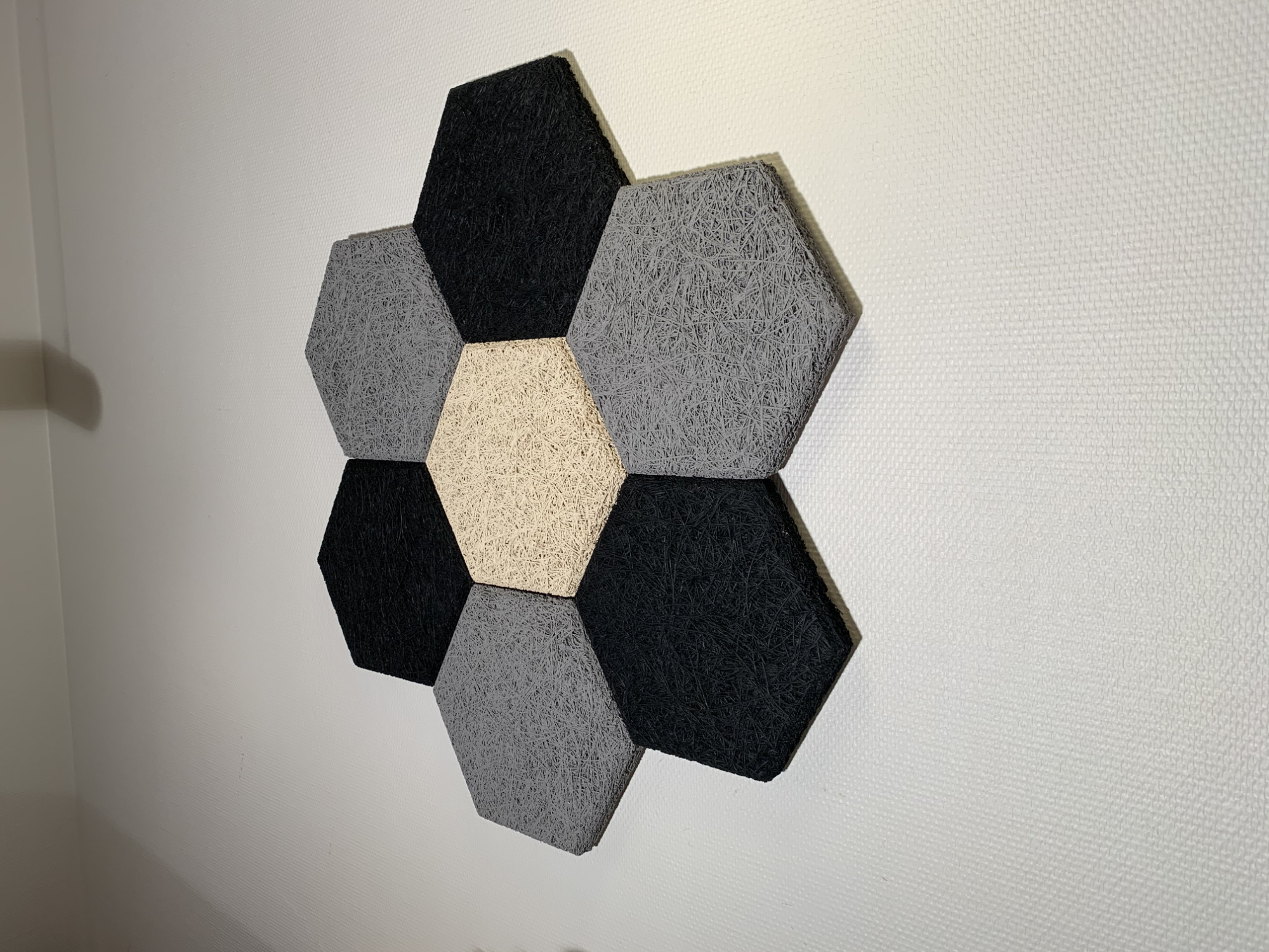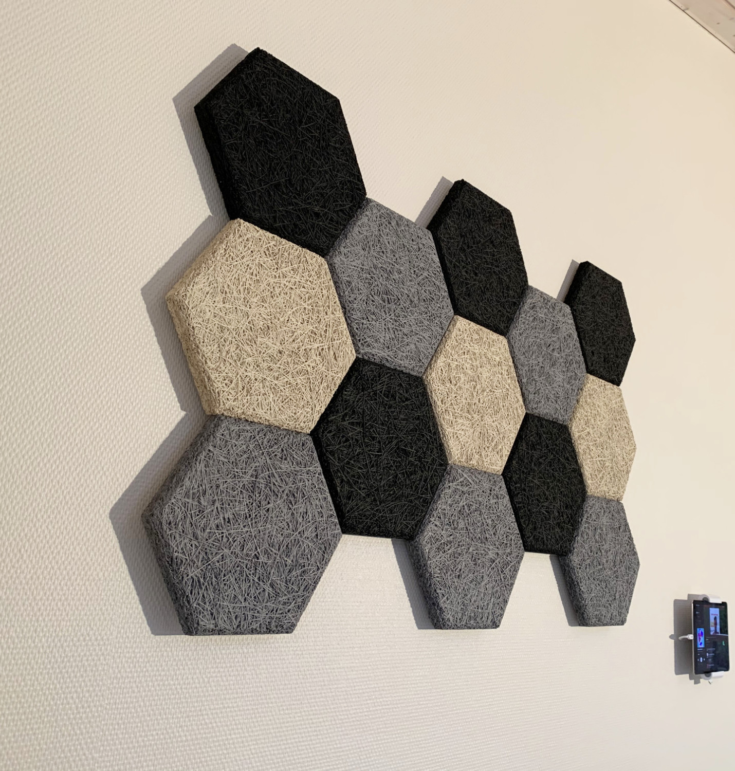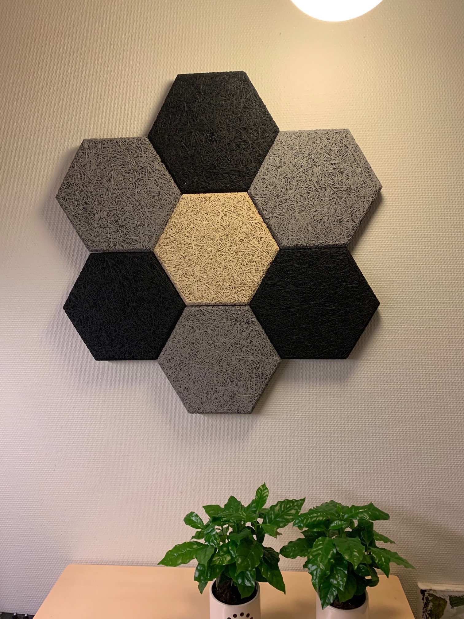 De fine Træbeton Hexagon akustikplader kan sammensættes i mindre og større mønstre og i forskellige farver. Få inspiration fra projekterne herunder.