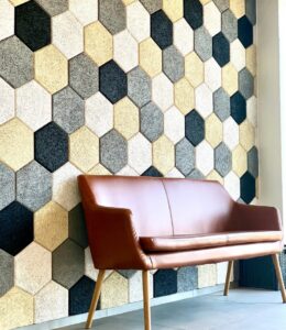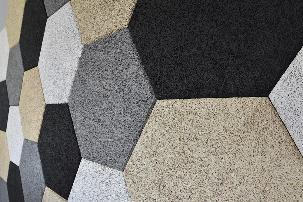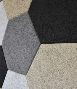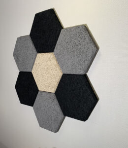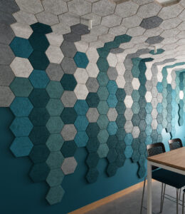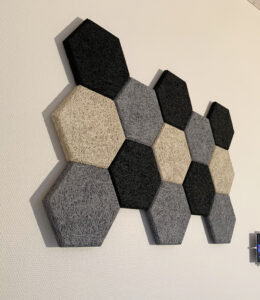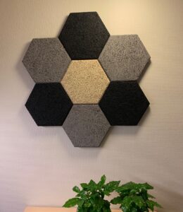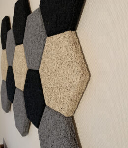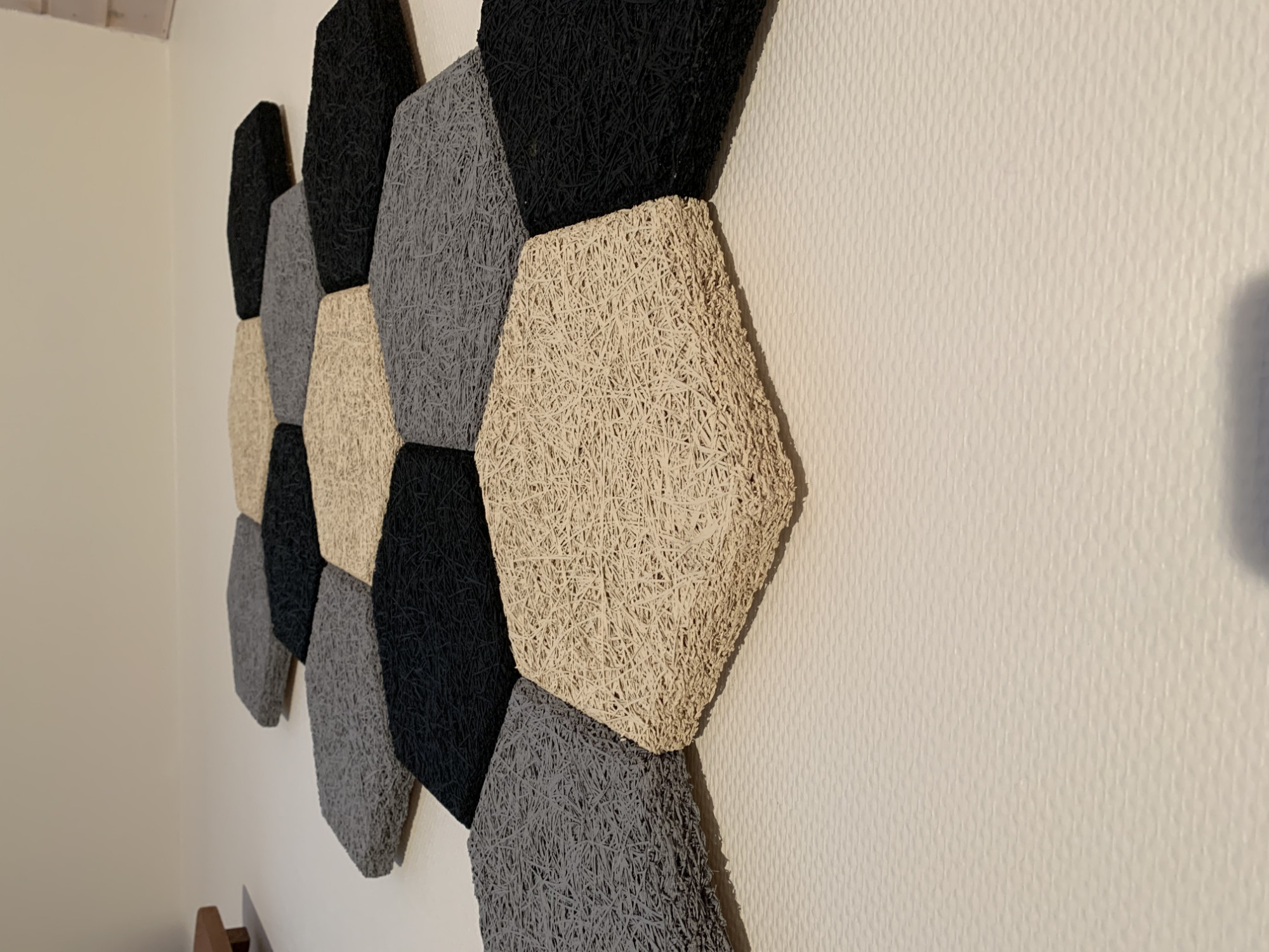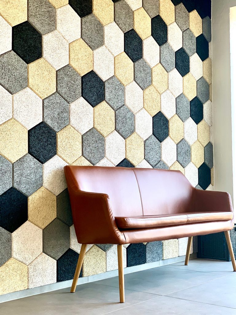 De fine Træbeton Hexagon akustikplader kan sammensættes i mindre og større mønstre og i forskellige farver. Få inspiration fra projekterne herunder.